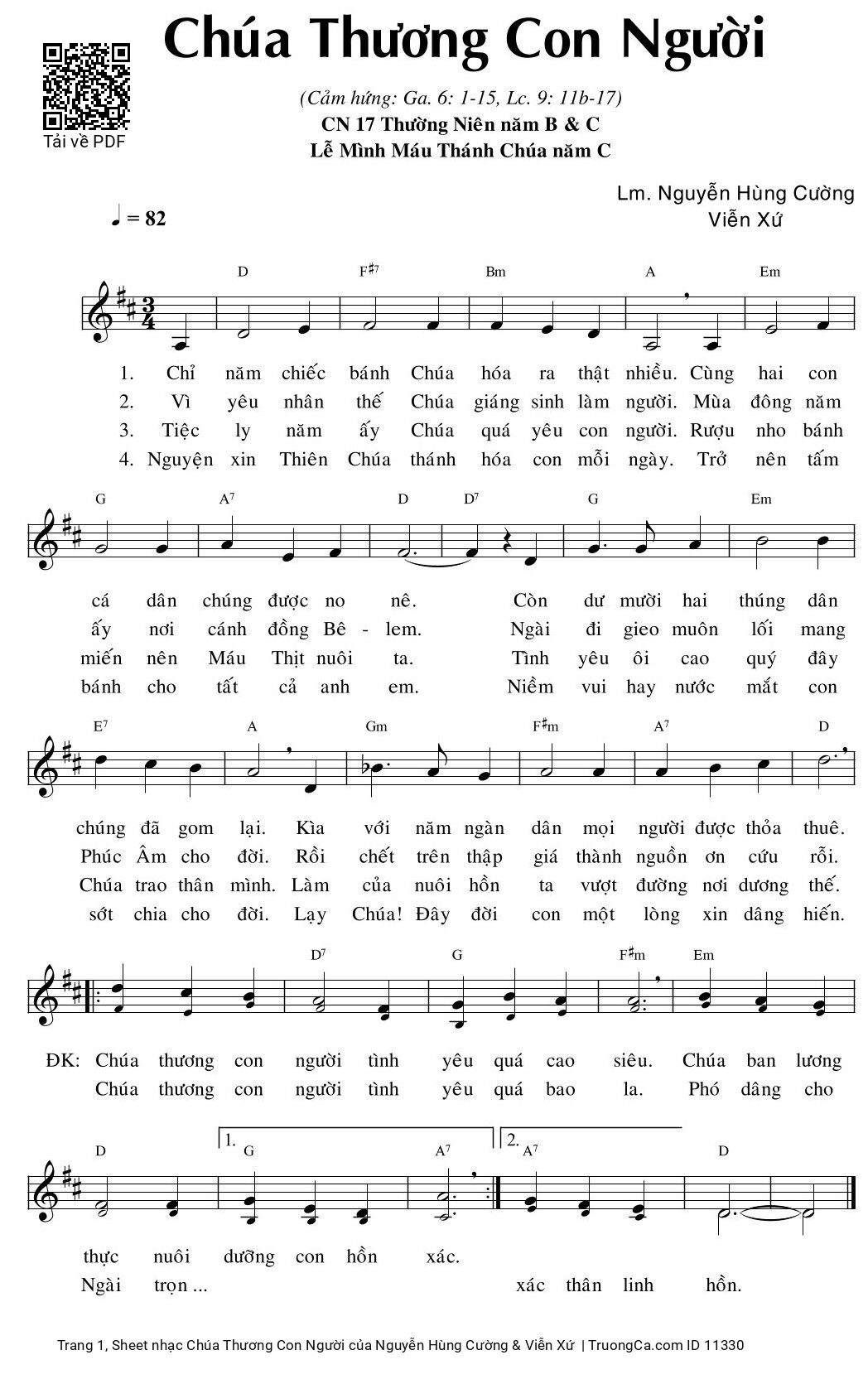 Phần nghe hát Chúa Thương Con Người (Nguyễn Hùng Cường & Viễn Xứ) được nhúng từ Youtube, Musescore hoặc link ngoài và chịu sự kiểm soát bản quyền của bên thứ ba đó, vì vậy có thể bị xóa hoặc chèn quảng cáo bất kỳ lúc nào. Nếu bạn không nghe - xem được ca sĩ hát tức là đã bị Youtube hoặc Musescore kiểm soát.