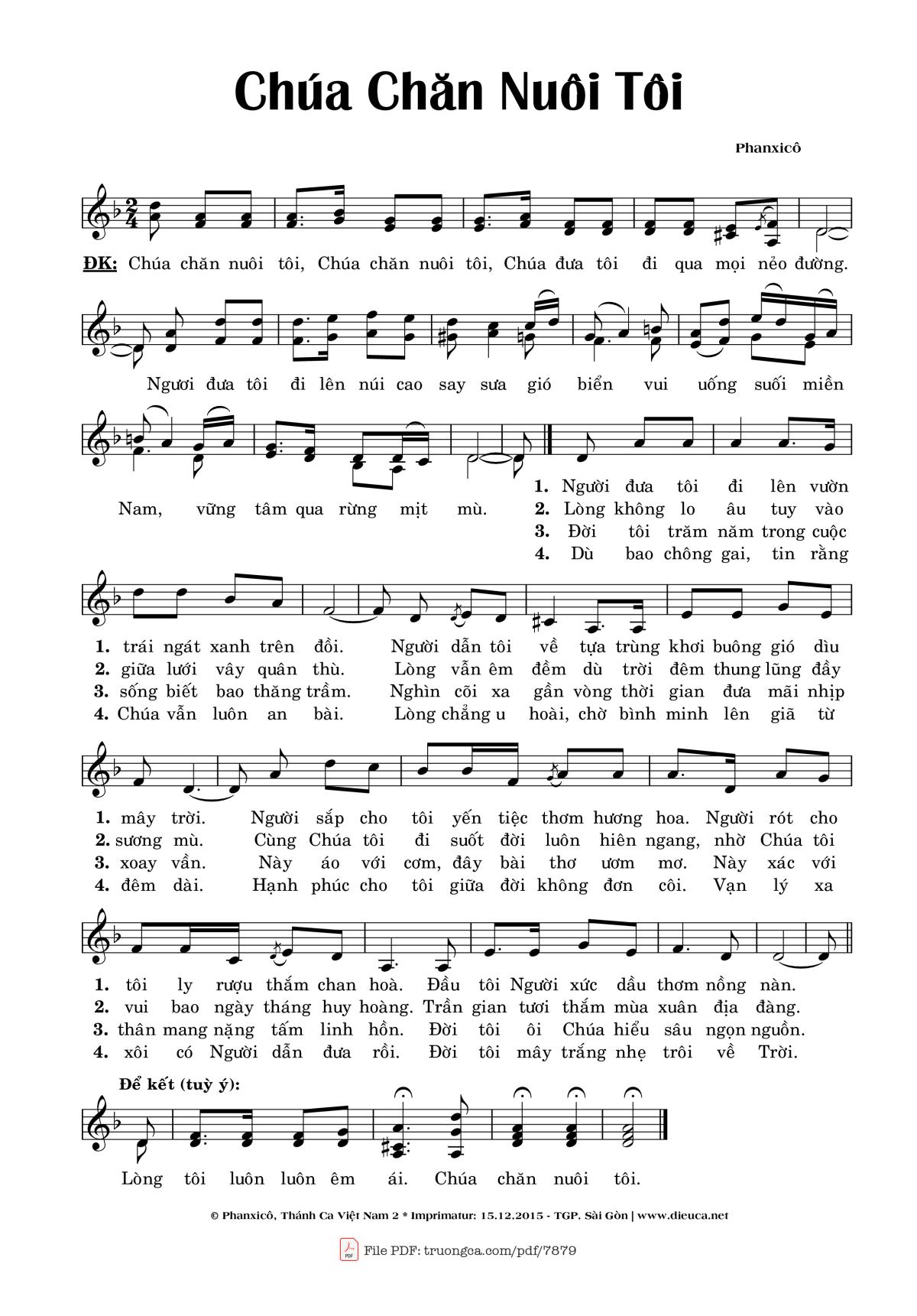 ĐK: Chúa chăn nuôi tôi, Chúa chăn nuôi tôi, Chúa đưa tôi đi qua mọi nẻo đường. Người đưa tôi đi lên núi cao say sưa gió biển, vui uống suối miền Nam, vững tâm qua rừng mịt mù. Kết: Lòng tôi luôn luôn em ái. Chúa chăn nuôi tôi.