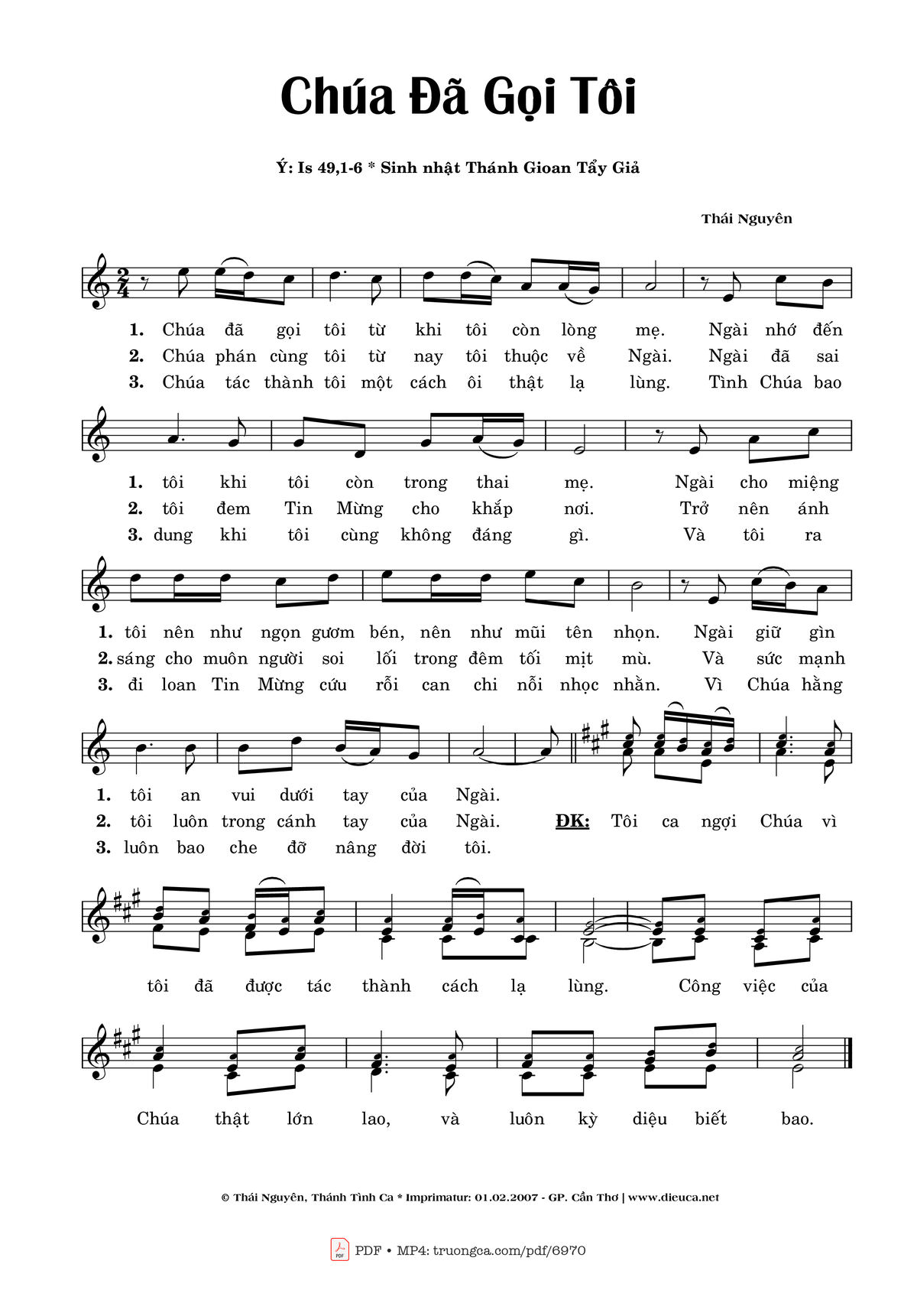 1. Chúa đã gọi tôi từ khi tôi còn lòng mẹ. Ngài nhớ đến tôi khi tôi còn trong thai mẹ. Ngài cho miệng tôi nên như ngọn gươm bén nên như mũi tên nhọn. Ngài giữ gìn tôi an vui dưới tay của Ngài. ĐK. Tôi ca ngợi Chúa vì tôi đã được tác thành cách lạ lùng.