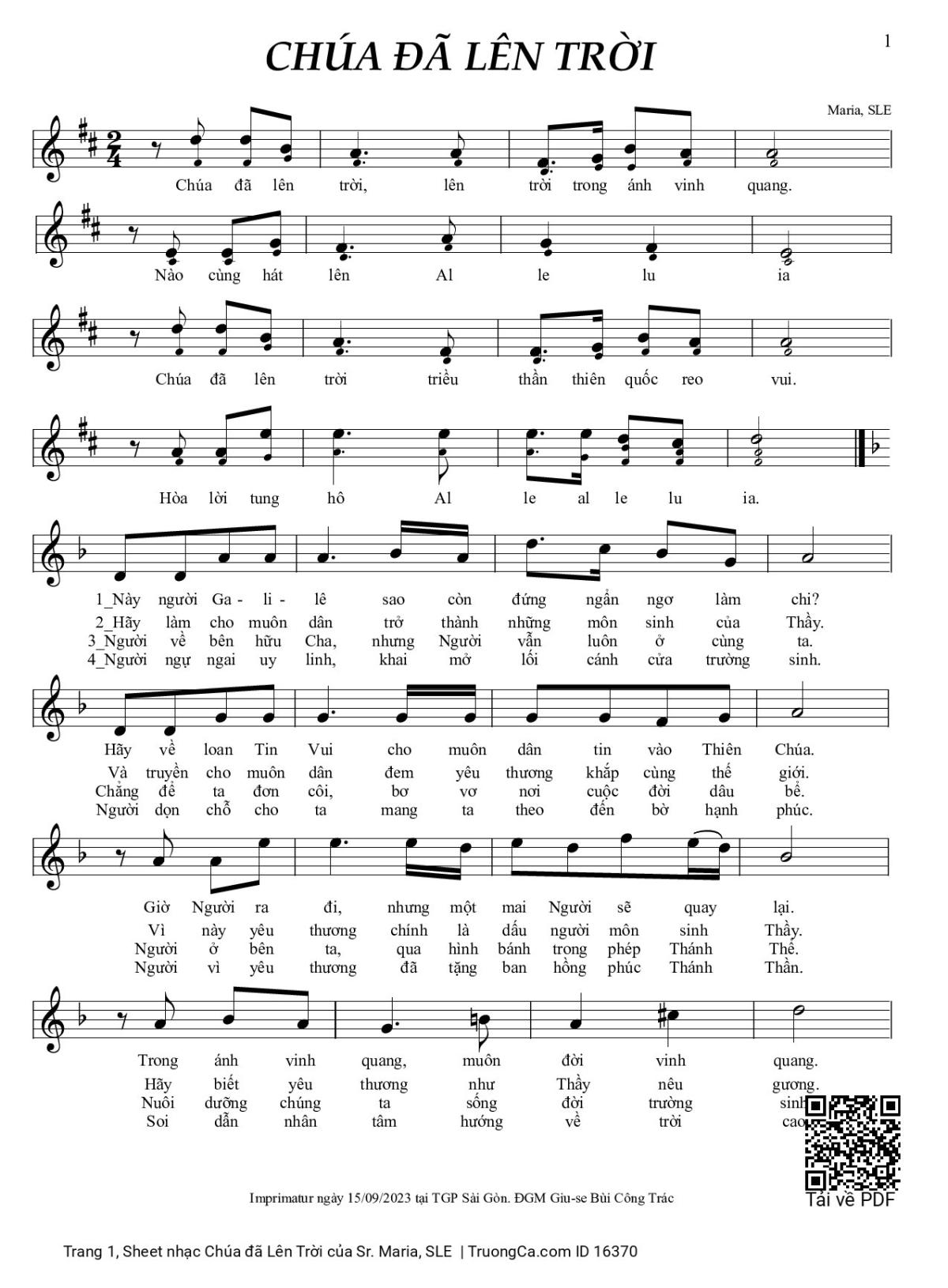 Điệp khúc. Chúa đã lên trời, lên trời trong ánh vinh quang, nào cùng hát lên Alleluia. Chúa đã lên trời, triều thần thiên quốc reo vui, hòa lời tung hô AlleAlleluia.