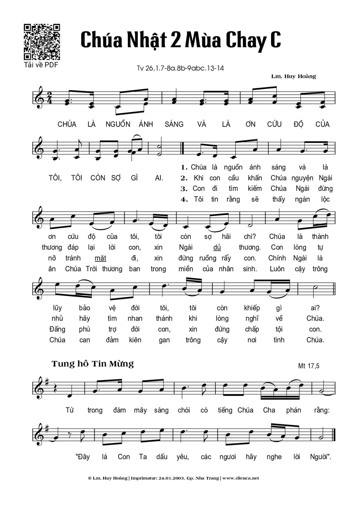 Điệp khúc: Chúa là nguồn ánh sáng và là ơn cứu độ của tôi, tôi còn sợ gì ai.