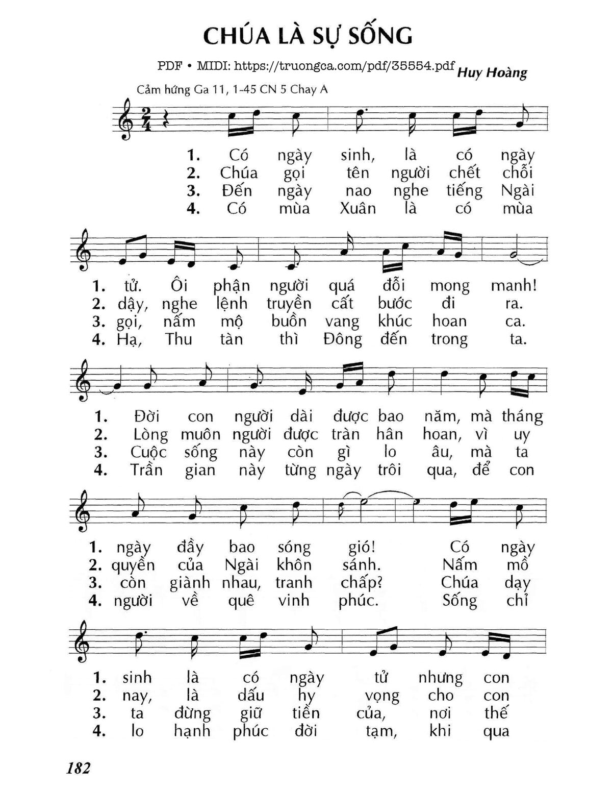Điệp khúc: Chúa là sự sống là sự sống lại. Người không có Chúa là mất tương lai. Nào ai có quyền ở nơi trần thế cho người sống lại từ đáy mồ sâu? Chúa là sự sống là sự sống lại. Ai tin nơi Ngài là có tương lai. Tương lai được vào ở trong Nước Chúa, sống đời an vui hạnh phúc muôn đời.