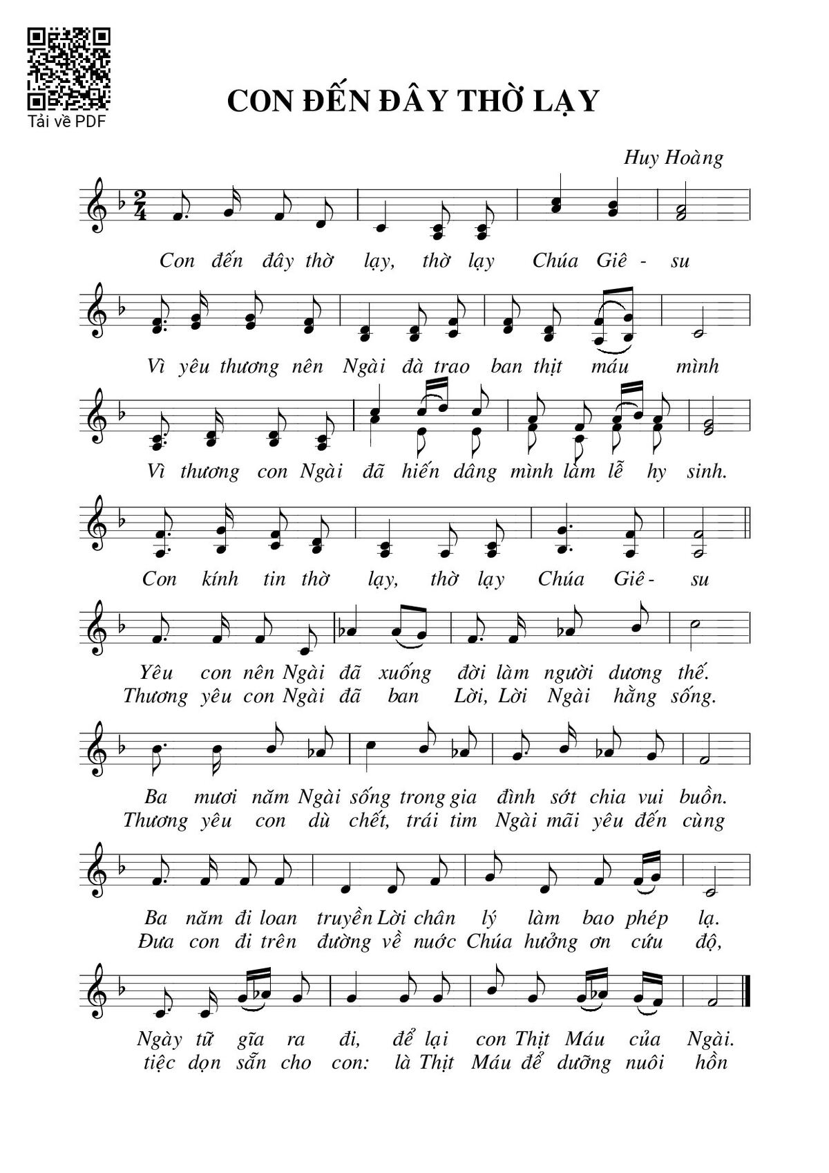 Điệp khúc: Con đến đây thờ lạy, thờ lạy Chúa Giê-su. Vì yêu thương nên Ngài đã trao ban thịt máu mình. Vì thương con Ngài đã hiến dâng mình làm lễ hy sinh. Con kính tin thờ lạy, thờ lạy Chúa Giê-su.