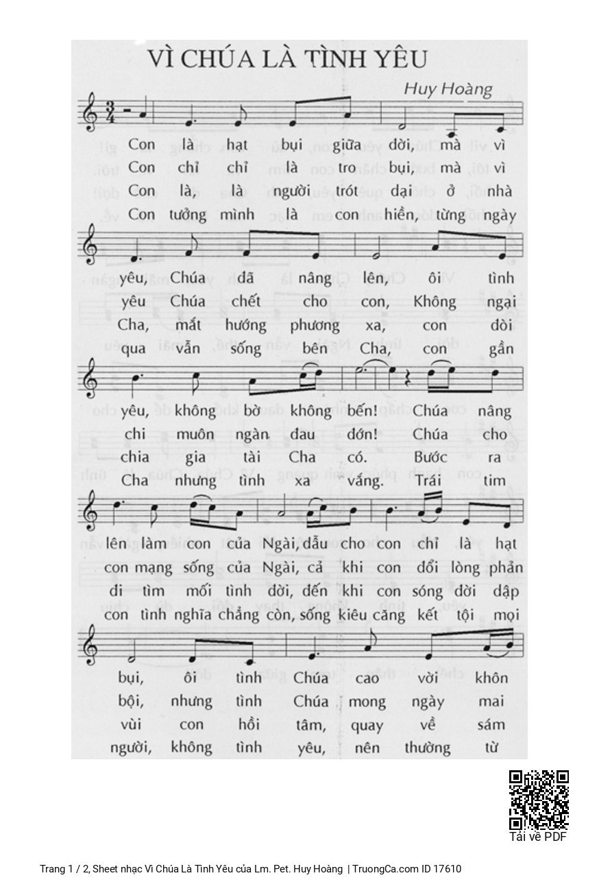 Điệp khúc. Vì Chúa, Chúa là tình yêu, mãi ngàn đời, tình Ngài vẫn thế, mãi yêu con, chấp nhận đau khổ, để cho con hạnh phúc vinh quang. Vì Chúa, Chúa là tình yêu, dẫu cho con tội lỗi thật nhiều, Ngài vẫn yêu, tình không thay đổi, dù chịu chết thân treo giữa đời.