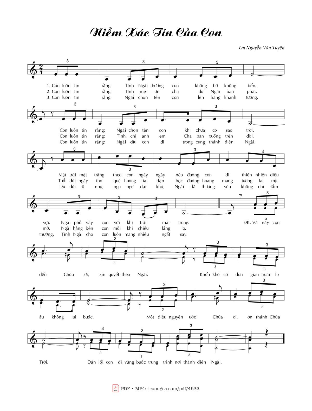 Chọn nút dấu + để tăng tông lên nửa cung, nút dấu - để giảm tông xuống nửa cung. Rê chuột vào hợp âm để xem các thế bấm hợp âm của bài hát Niềm xác tín của con.