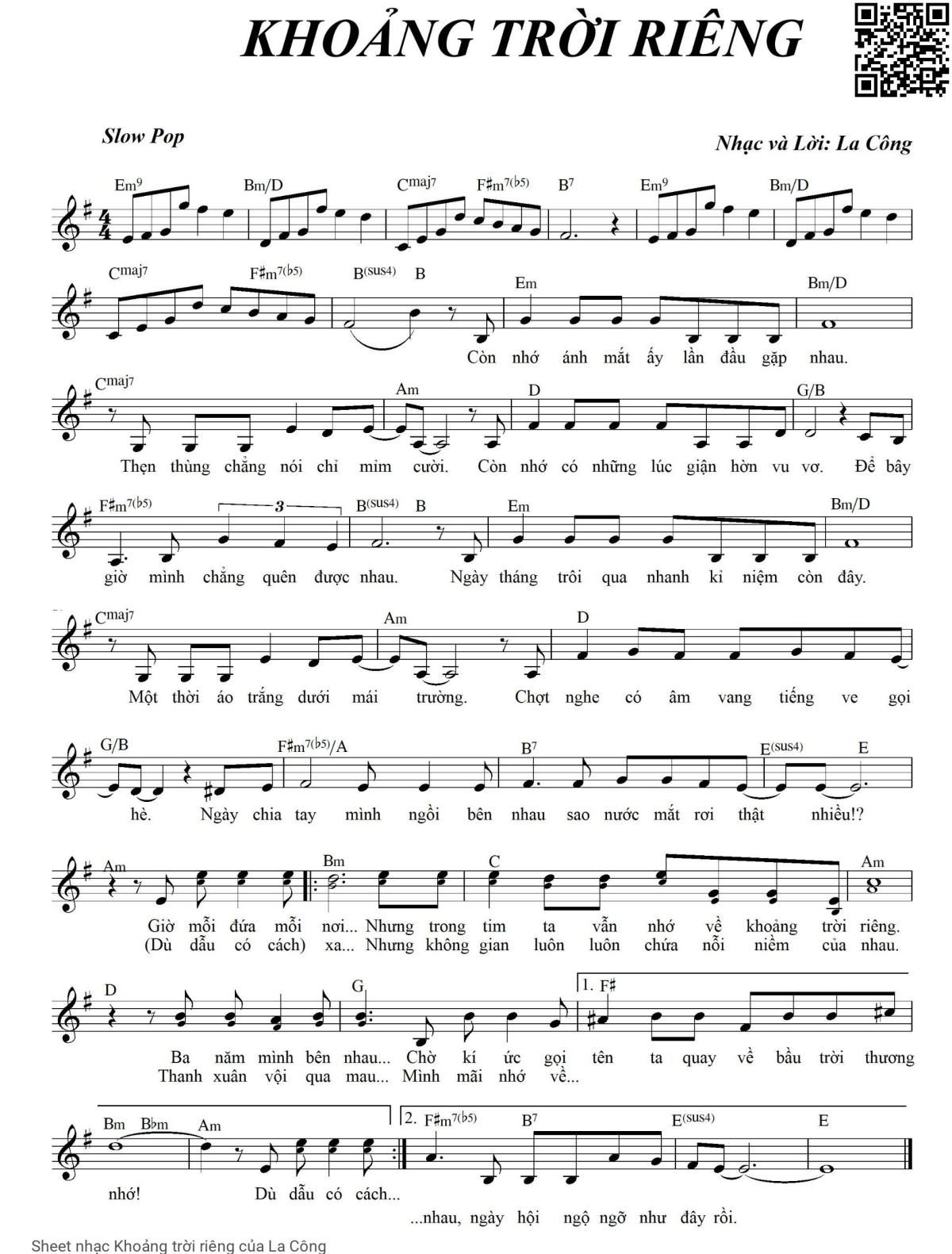 Phần nghe hát Khoảng trời riêng (La Công) được nhúng từ Youtube, Musescore hoặc link ngoài và chịu sự kiểm soát bản quyền của bên thứ ba đó, vì vậy có thể bị xóa hoặc chèn quảng cáo bất kỳ lúc nào. Nếu bạn không nghe - xem được ca sĩ hát tức là đã bị Youtube hoặc Musescore kiểm soát.