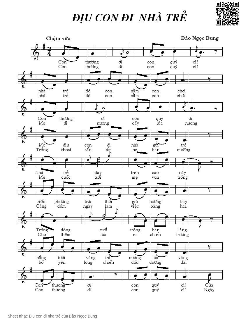 Chọn nút dấu + để tăng tông lên nửa cung, nút dấu - để giảm tông xuống nửa cung. Rê chuột vào hợp âm để xem các thế bấm hợp âm của bài hát Địu con đi nhà trẻ.