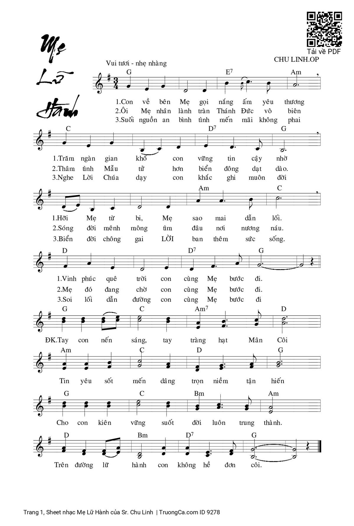 1. Con về bên Mẹ gọi nắng ấm yêu thương Trăm ngàn gian khổ con vững tin cậy nhờ Hỡi Mẹ từ bi, Mẹ sao mai dẫn lối. Vinh phúc quê trời con cùng Mẹ bước đi.