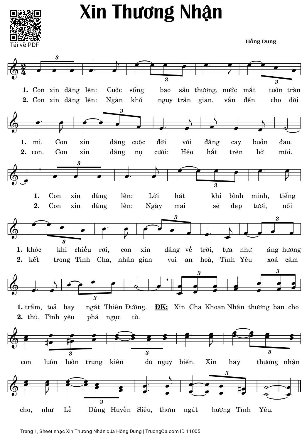 Chọn nút dấu + để tăng tông lên nửa cung, nút dấu - để giảm tông xuống nửa cung. Rê chuột vào hợp âm để xem các thế bấm hợp âm của bài hát Xin Thương Nhận.