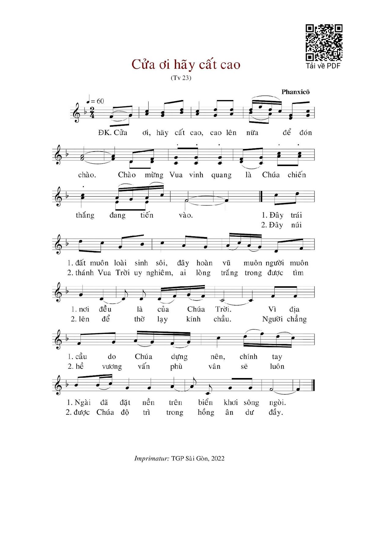 Điệp khúc. Cửa ơi, hãy cất cao, cao lên nữa để đón chào. Chào mừng Vua vinh quang là Chúa chiến thắng đang tiến vào.