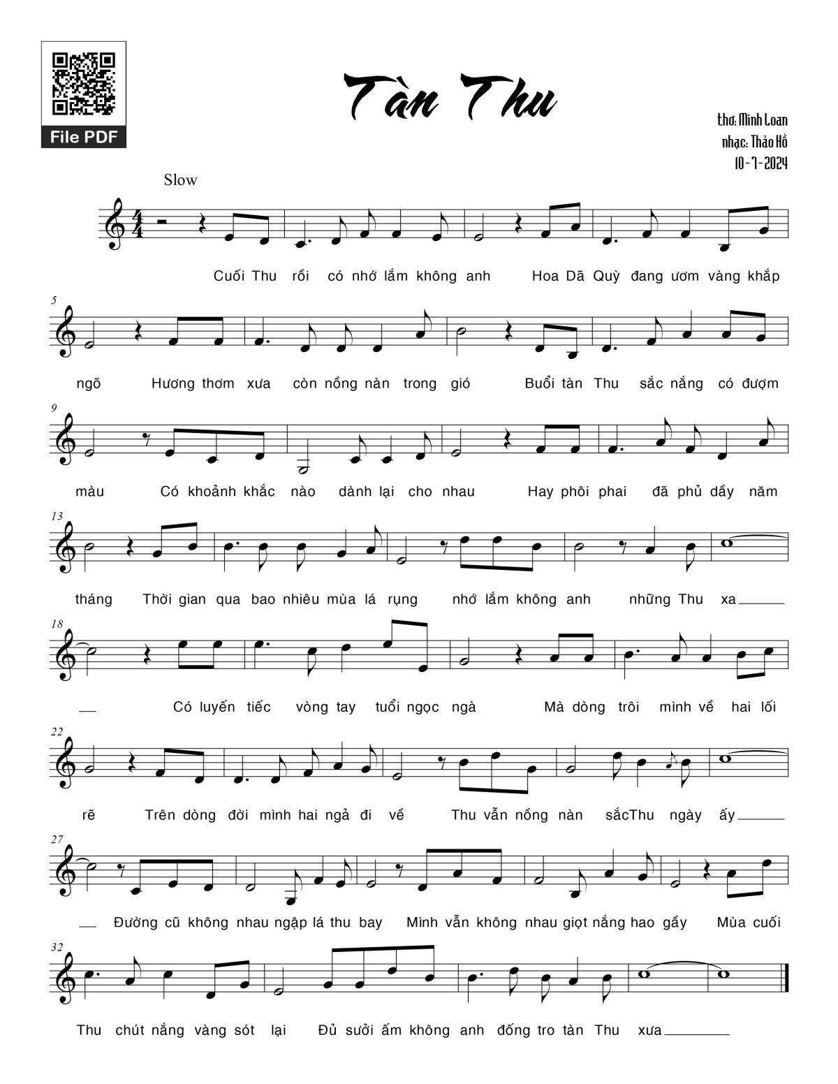 Phần nghe hát Tàn Thu (Thảo Hồ) được nhúng từ Youtube, Musescore hoặc link ngoài và chịu sự kiểm soát bản quyền của bên thứ ba đó, vì vậy có thể bị xóa hoặc chèn quảng cáo bất kỳ lúc nào. Nếu bạn không nghe - xem được ca sĩ hát tức là đã bị Youtube hoặc Musescore kiểm soát.