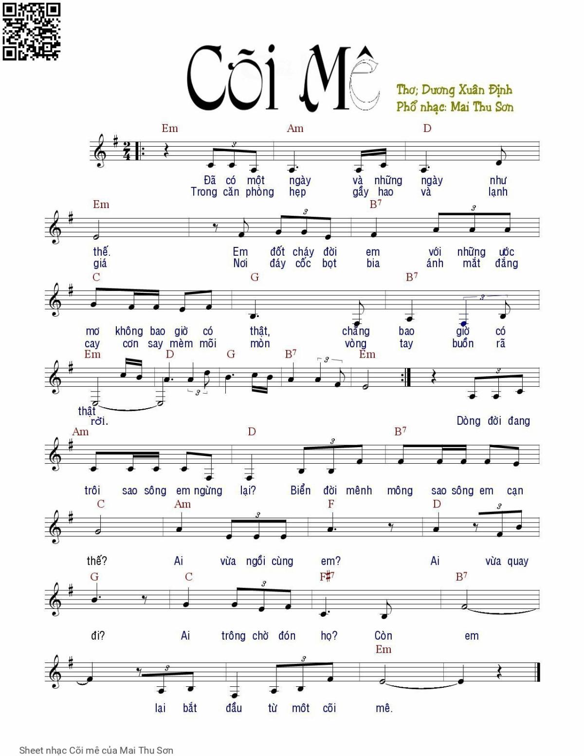 Chọn nút dấu + để tăng tông lên nửa cung, nút dấu - để giảm tông xuống nửa cung. Rê chuột vào hợp âm để xem các thế bấm hợp âm của bài hát Cõi mê.