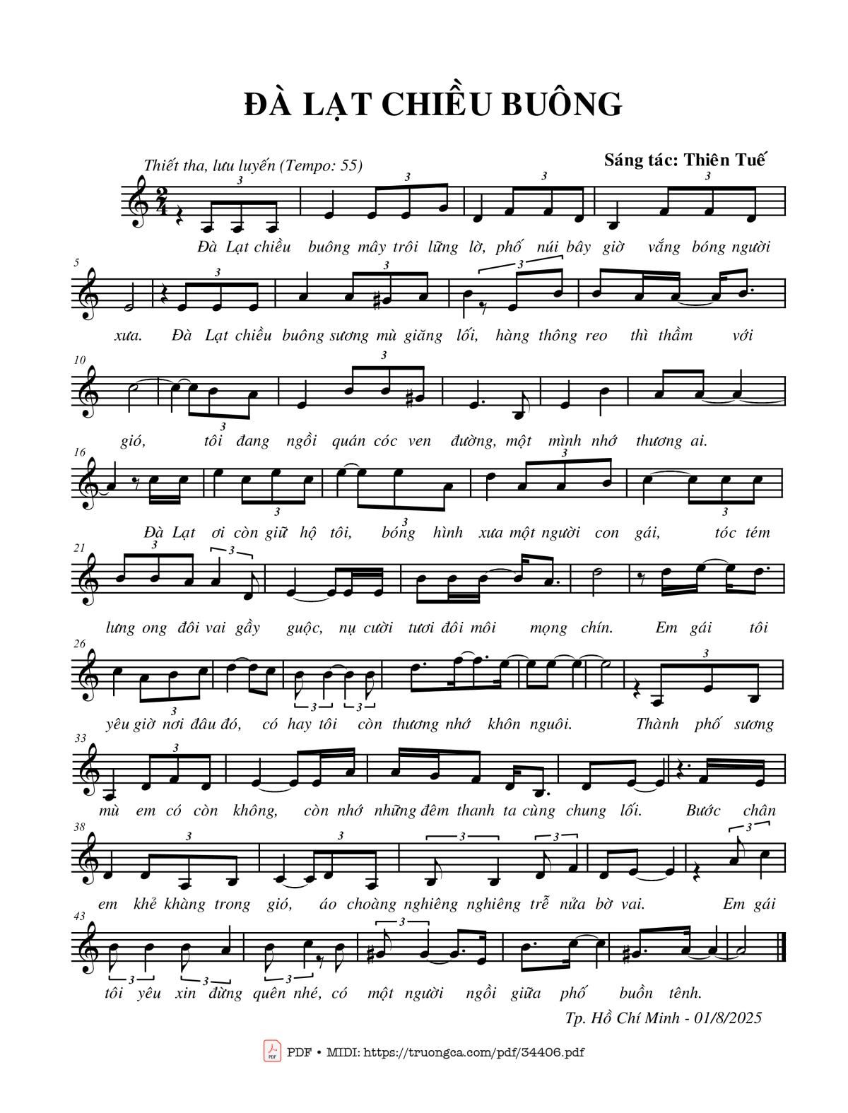 Thiên Tuế Đà Lạt chiều buông mây trôi lững lờ Phố núi bây giờ vắng bóng người xưa [PDF] [Sheet] [Lời H.A] [Mp4/Midi]