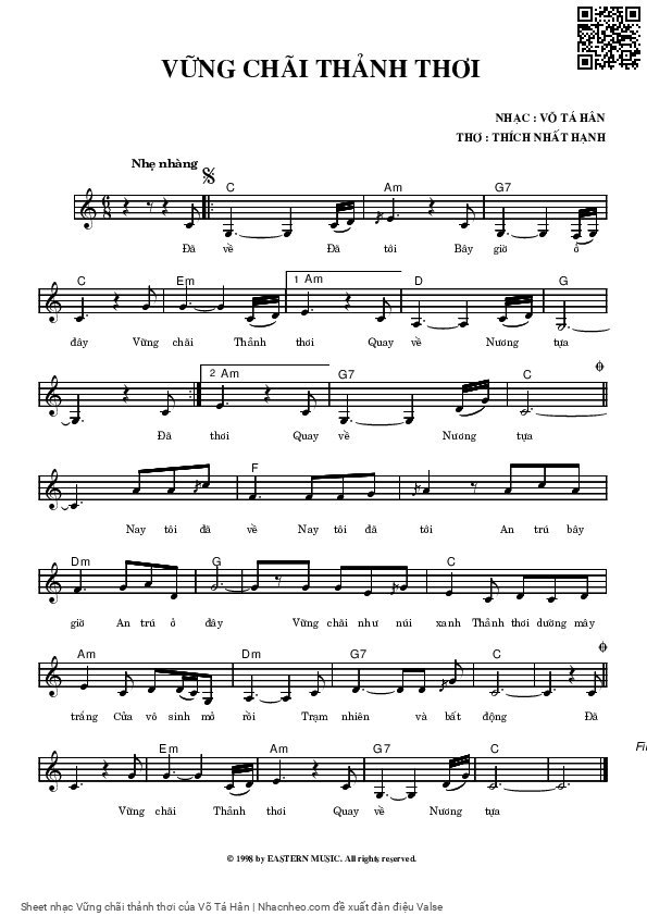 Chọn nút dấu + để tăng tông lên nửa cung, nút dấu - để giảm tông xuống nửa cung. Rê chuột vào hợp âm để xem các thế bấm hợp âm của bài hát Vững chãi thảnh thơi.