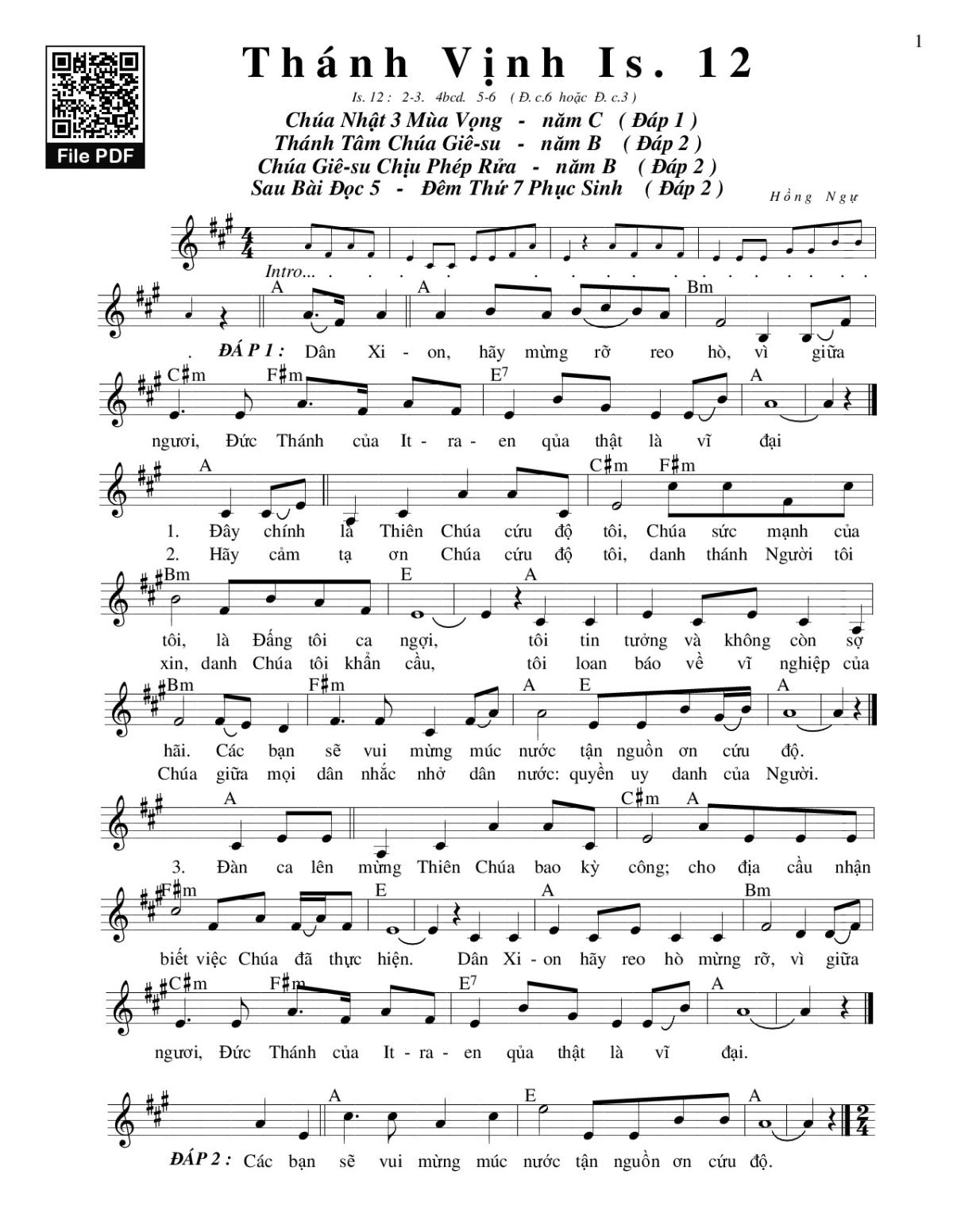 1. Đây chính là Thiên Chúa cứu độ tôi, Chúa sức mạnh của tôi, là Đấng tôi ca ngợi, tôi tin tưởng và không còn sợ hãi. Các bạn sẽ vui mừng múc nước tận nguồn ơn cứu độ.