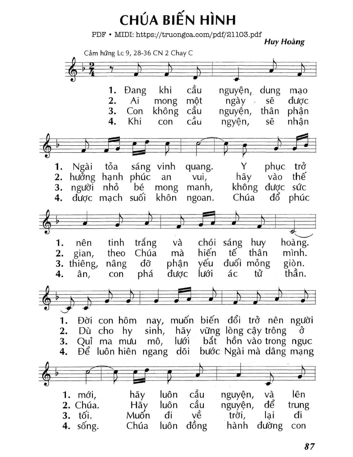1. Đang khi cầu nguyện, dung mạo Ngài toả sáng vinh quang. Y phục trở nên tinh trắng và chói sáng huy hoàng. Đời con hôm nay, muốn biến đổi trở nên người mới, hãy luôn cầu nguyện, và lên cao, ra khỏi chốn ồn ào.