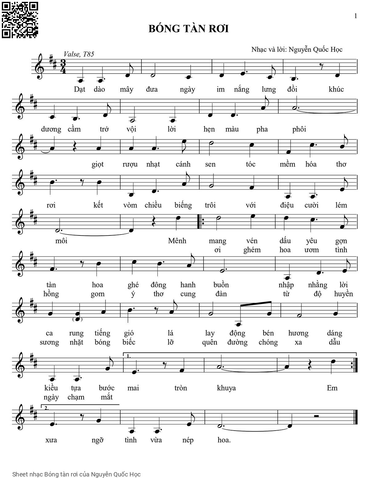 Phần nghe hát Bóng tàn rơi (Nguyễn Quốc Học) được nhúng từ Youtube, Musescore hoặc link ngoài và chịu sự kiểm soát bản quyền của bên thứ ba đó, vì vậy có thể bị xóa hoặc chèn quảng cáo bất kỳ lúc nào. Nếu bạn không nghe - xem được ca sĩ hát tức là đã bị Youtube hoặc Musescore kiểm soát.