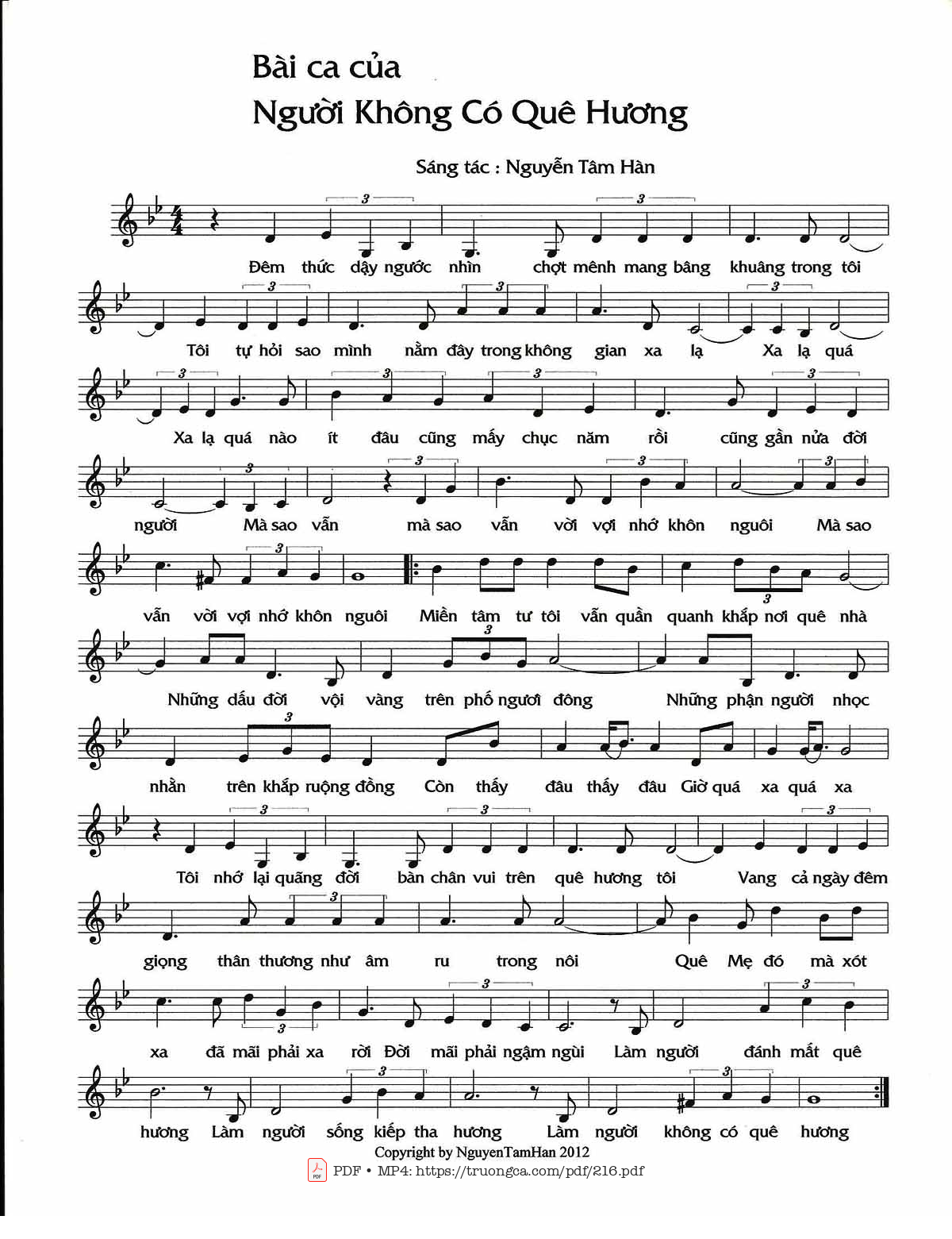 Phần nghe hát Bài ca của người không có quê hương (Nguyễn Tâm Hàn) được nhúng từ Youtube, Musescore hoặc link ngoài và chịu sự kiểm soát bản quyền của bên thứ ba đó, vì vậy có thể bị xóa hoặc chèn quảng cáo bất kỳ lúc nào. Nếu bạn không nghe - xem được ca sĩ hát tức là đã bị Youtube hoặc Musescore kiểm soát.