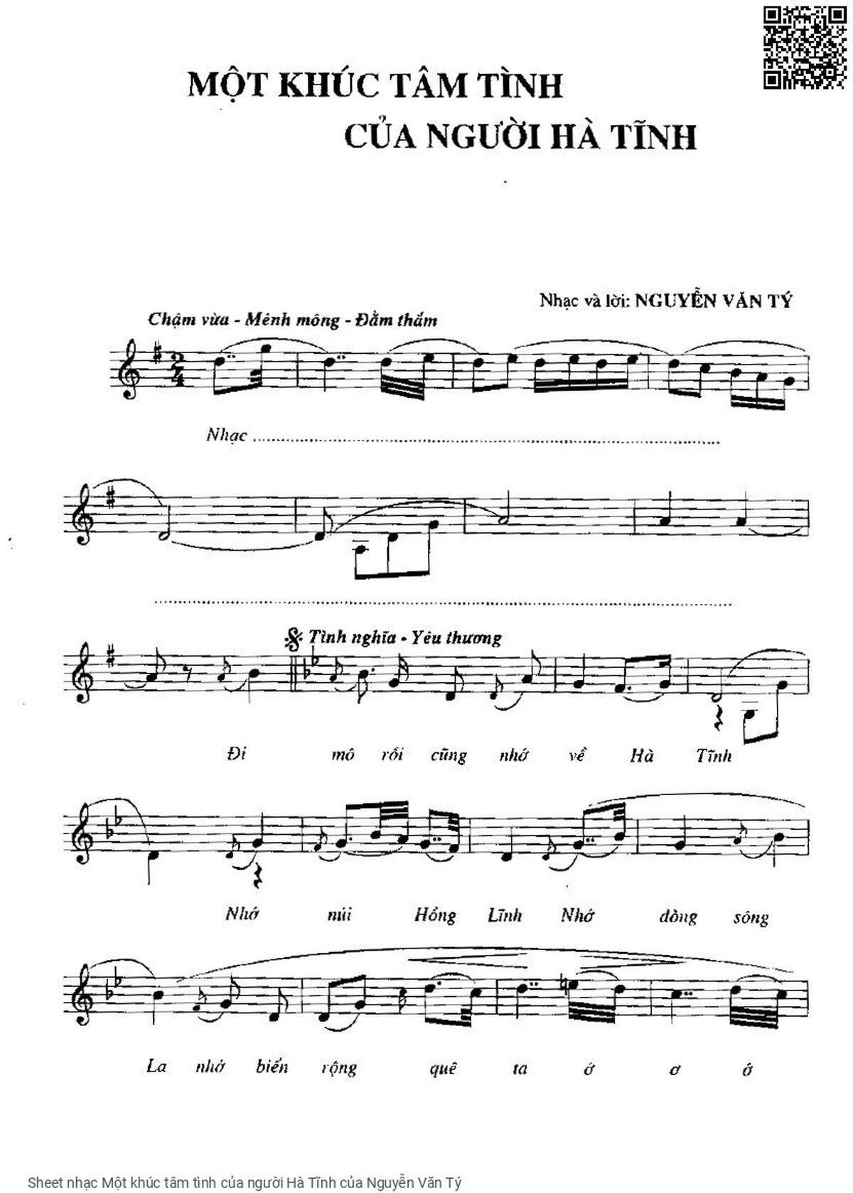 Phần nghe hát Một khúc tâm tình của người Hà Tĩnh (Nguyễn Văn Tý) được nhúng từ Youtube, Musescore hoặc link ngoài và chịu sự kiểm soát bản quyền của bên thứ ba đó, vì vậy có thể bị xóa hoặc chèn quảng cáo bất kỳ lúc nào. Nếu bạn không nghe - xem được ca sĩ hát tức là đã bị Youtube hoặc Musescore kiểm soát.