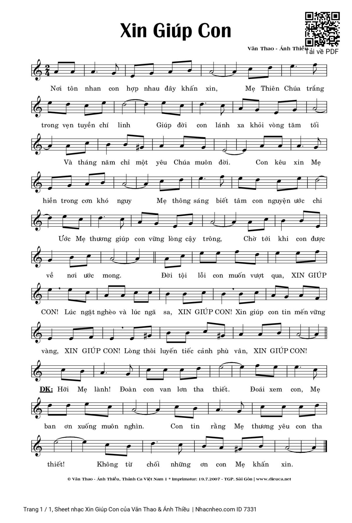 Phần nghe hát Xin Giúp Con (Văn Thao & Ánh Thiều) được nhúng từ Youtube, Musescore hoặc link ngoài và chịu sự kiểm soát bản quyền của bên thứ ba đó, vì vậy có thể bị xóa hoặc chèn quảng cáo bất kỳ lúc nào. Nếu bạn không nghe - xem được ca sĩ hát tức là đã bị Youtube hoặc Musescore kiểm soát.