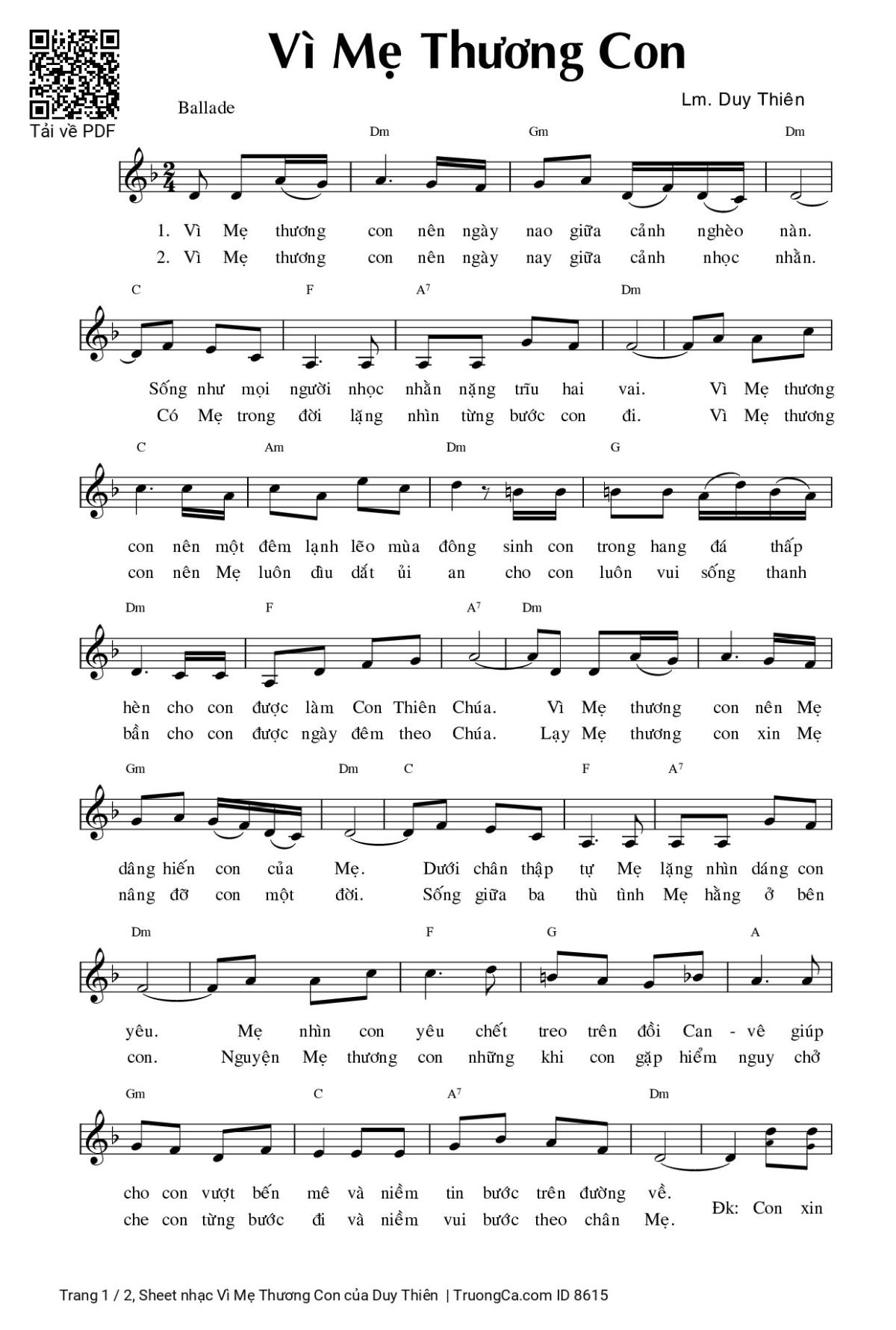 Duy Thiên Đức Mẹ Vì Mẹ thương con nên ngày nao giữa cảnh nghèo nàn [PDF] [Sheet] [Lời H.A] [Mp4/Midi]