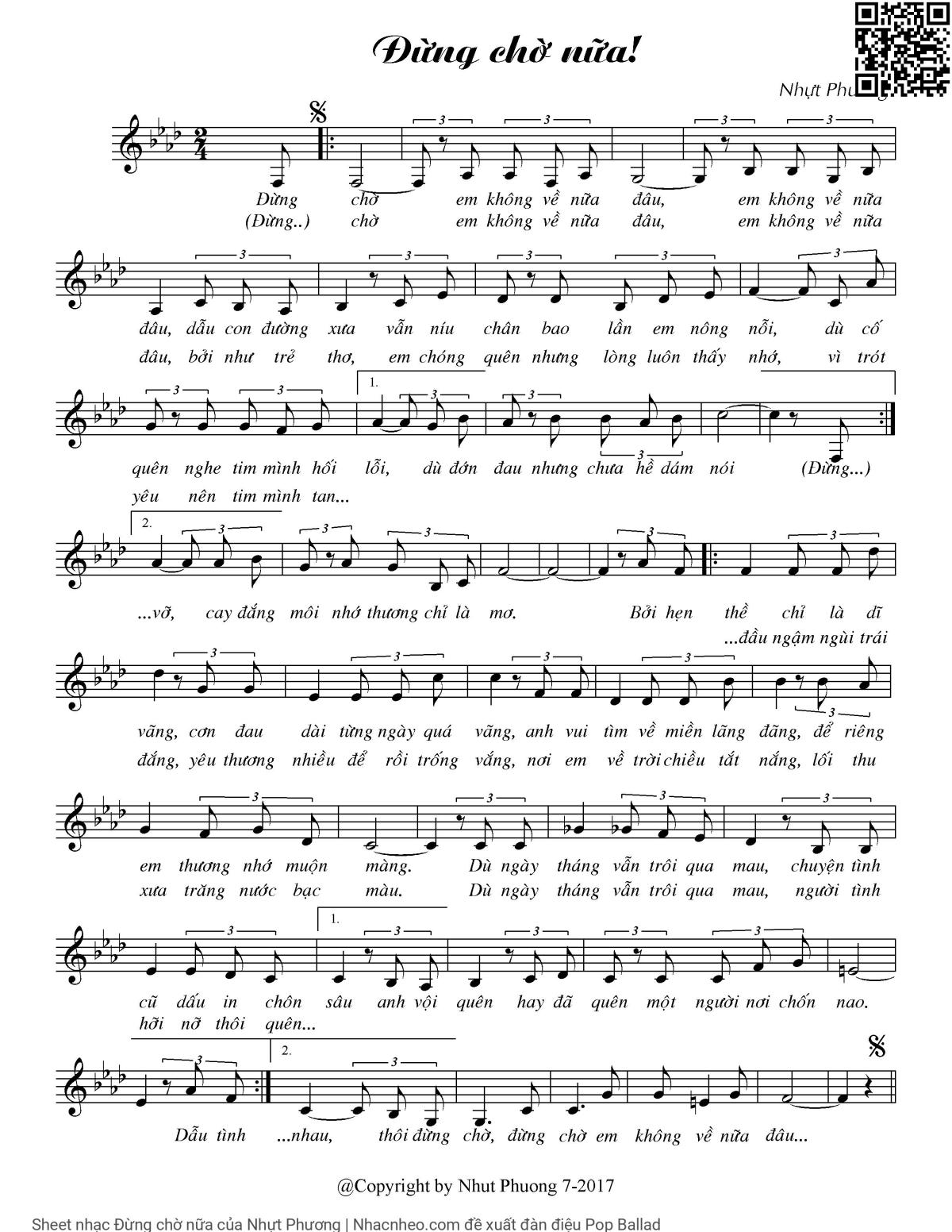 Chọn nút dấu + để tăng tông lên nửa cung, nút dấu - để giảm tông xuống nửa cung. Rê chuột vào hợp âm để xem các thế bấm hợp âm của bài hát Đừng chờ nữa.