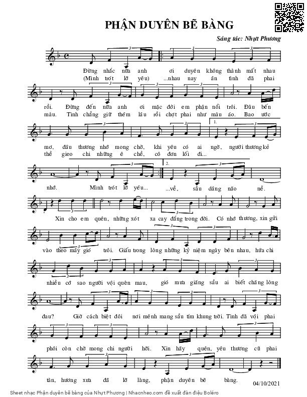Nhựt Phương Đừng nhắc nữa anh ơi duyên không thành mất nhau rồi [PDF] [Sheet] [Lời H.A] [Mp4/Midi]