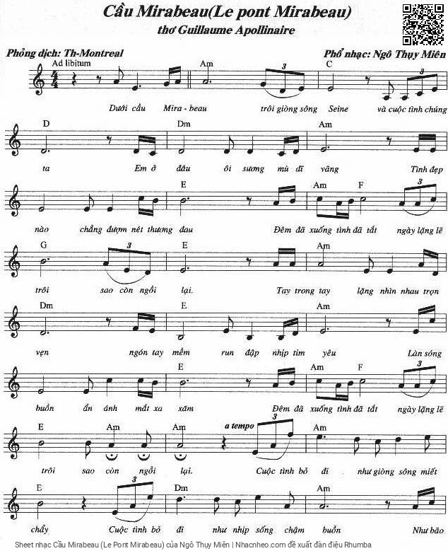 Ngô Thụy Miên Dưới cầu Mira beau Trôi dòng sông Seine Và cuộc tình chúng ta [PDF] [Sheet] [Lời H.A] [Mp4/Midi]