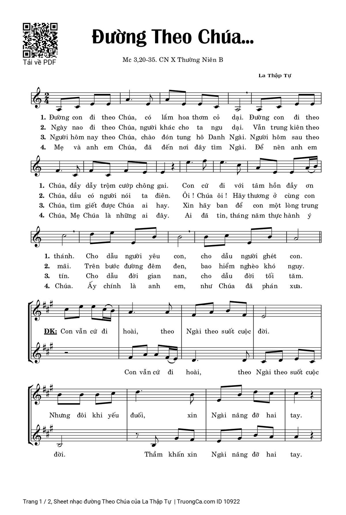 1. Đường con đi theo Chúa, có lắm hoa thơm cỏ dại. Đường con đi theo Chúa, đầy dẫy trộm cướp chông gai. Con cứ đi với tâm hồn đầy ơn thánh. Cho dẫu người yêu con, cho dẫu người ghét con.