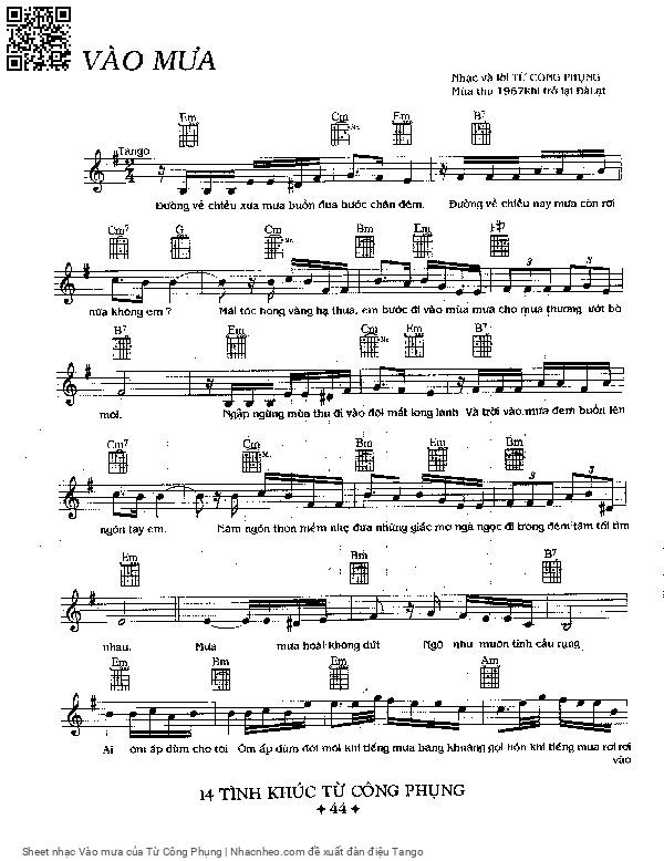 Chọn nút dấu + để tăng tông lên nửa cung, nút dấu - để giảm tông xuống nửa cung. Rê chuột vào hợp âm để xem các thế bấm hợp âm của bài hát Vào mưa.