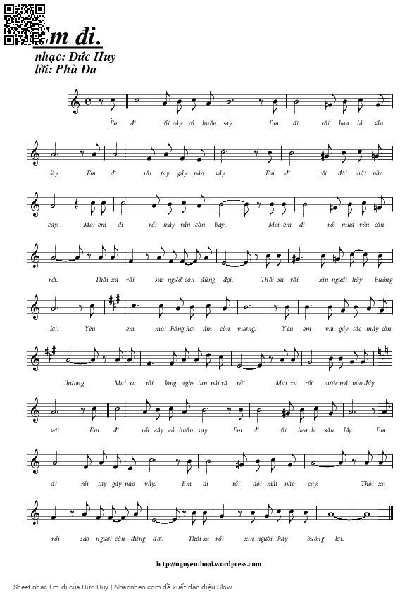Đức Huy Em đi rồi cây cỏ buồn say Em đi rồi hoa lá sầu lây [PDF] [Sheet] [Lời H.A] [Mp4/Midi]