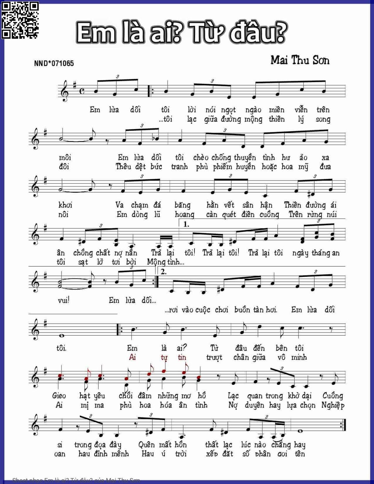 Mai Thu Sơn Em lừa dối tôi lời nói ngọt ngào miên viễn trên môi [PDF] [Sheet] [Lời H.A] [Mp4/Midi]