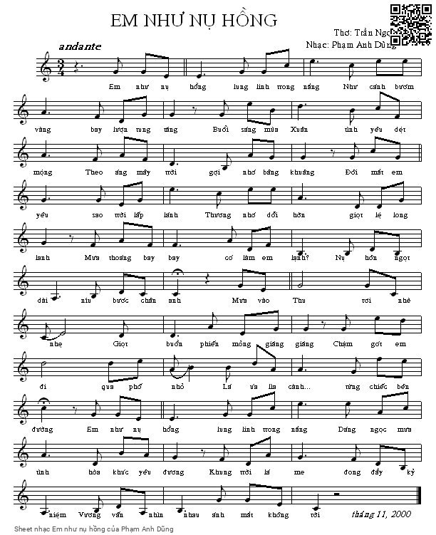 Chọn nút dấu + để tăng tông lên nửa cung, nút dấu - để giảm tông xuống nửa cung. Rê chuột vào hợp âm để xem các thế bấm hợp âm của bài hát Em như nụ hồng.