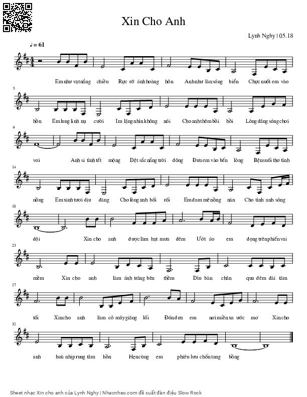 Phần nghe hát Xin cho anh (Lynh Nghy) được nhúng từ Youtube, Musescore hoặc link ngoài và chịu sự kiểm soát bản quyền của bên thứ ba đó, vì vậy có thể bị xóa hoặc chèn quảng cáo bất kỳ lúc nào. Nếu bạn không nghe - xem được ca sĩ hát tức là đã bị Youtube hoặc Musescore kiểm soát.