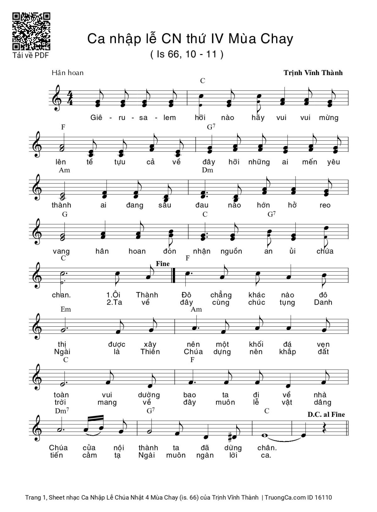 Điệp khúc. Giê-su-sa-lem hỡi nào hãy vui vui mừng lên, tề tựu cả về đây hỡi những ai mến yêu thành. Ai đang sầu đau hớn hở reo vang, hân hoan đón nhận nguồn an ủi chứa chan.