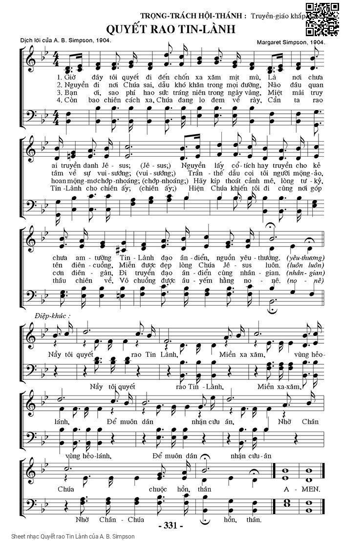 A. B. Simpson Giờ đây tôi quyết đi đến chốn xa xăm mịt mù [PDF] [Sheet] [Lời H.A] [Mp4/Midi]