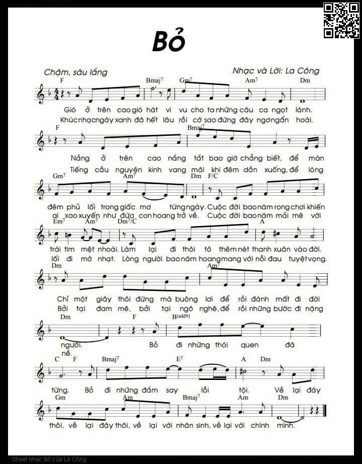 Phần nghe hát Bỏ (La Công) được nhúng từ Youtube, Musescore hoặc link ngoài và chịu sự kiểm soát bản quyền của bên thứ ba đó, vì vậy có thể bị xóa hoặc chèn quảng cáo bất kỳ lúc nào. Nếu bạn không nghe - xem được ca sĩ hát tức là đã bị Youtube hoặc Musescore kiểm soát.