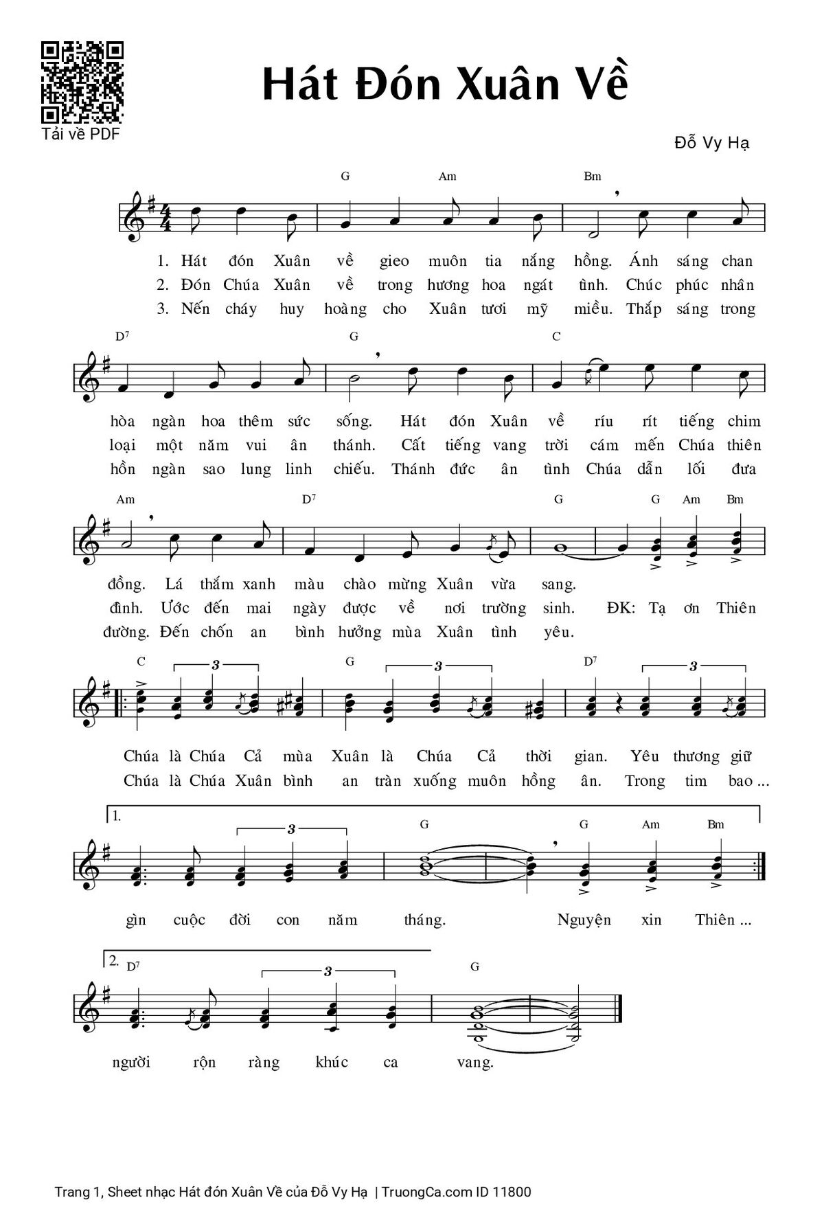 Điệp khúc. Tạ ơn Thiên Chúa là Chúa cả mùa Xuân, là Chúa Cả thời gian. Yêu thương giữ gìn cuộc đời con năm tháng. Nguyện xin Thiên Chúa là Chúa Xuân bình an, tràn xuống muôn hồng ân. Trong tim bao người rộn ràng khúc ca vang.