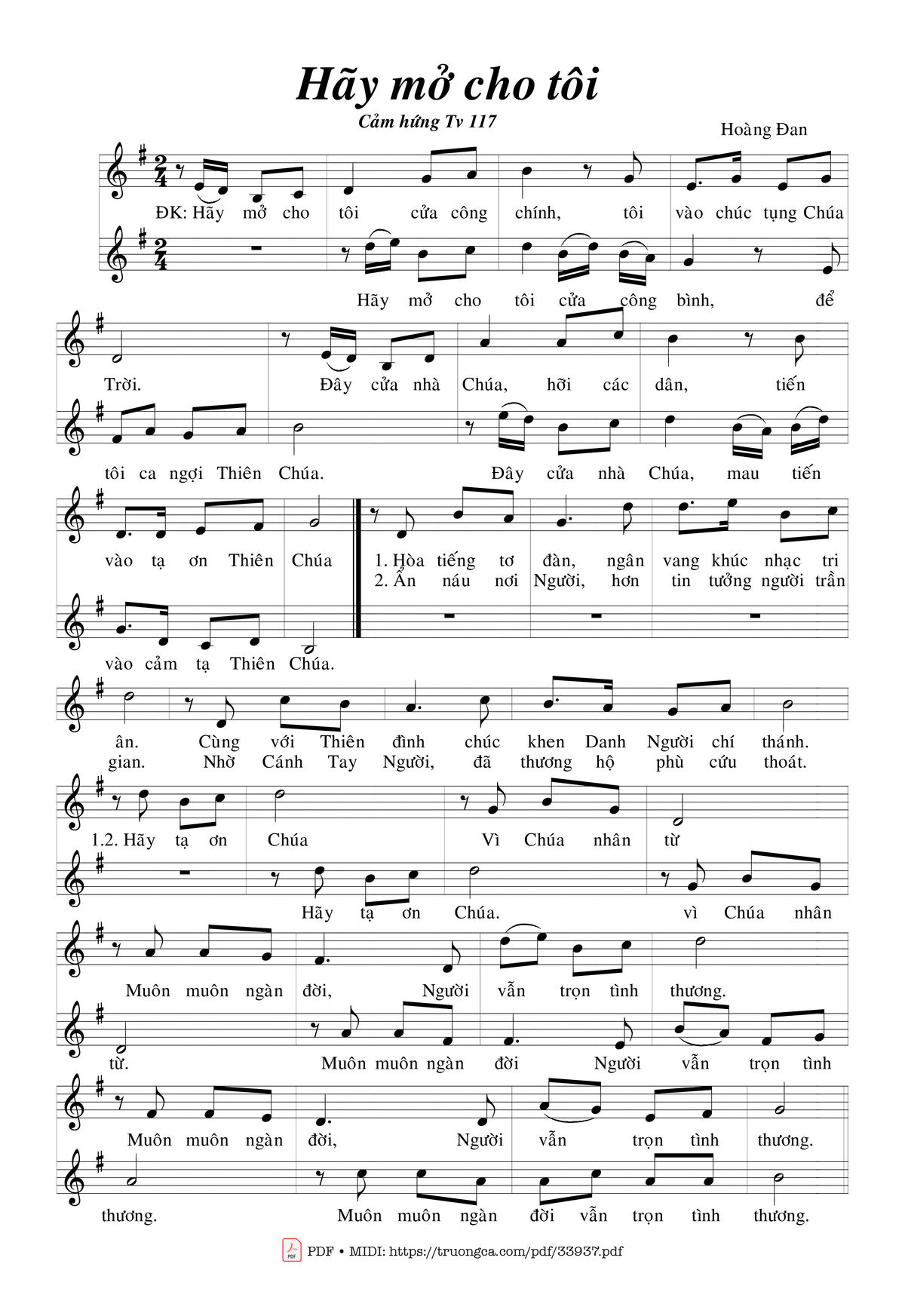 Điệp khúc : Hãy mở cho tôi cửa công chính, tôi vào chúc tụng Chúa Trời. Đây cửa nhà Chúa, hỡi các dân, tiến vào tạ ơn Thiên Chúa