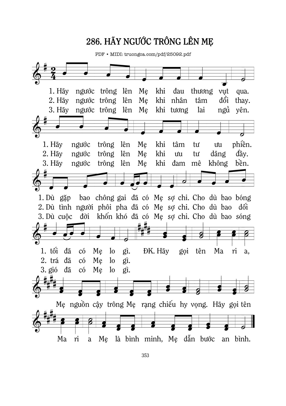 1- Hãy ngươc trông lên Mẹ khi đau thương vụt qua. Hãy ngước trông lên Mẹ khi tâm tư ưu phiền. Dù gặp bao chông gai đã có Mẹ sợ chi. Cho dù bao bóng tối đã có Mẹ lo gì.