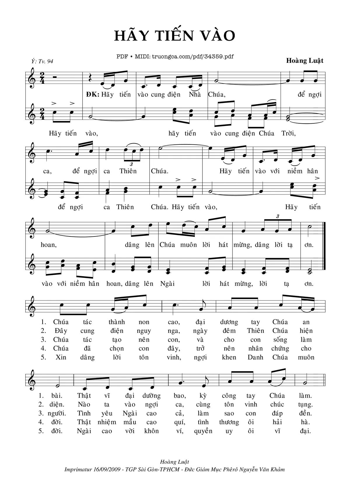 Điệp khúc. Hãy tiến vào cung điện Nhà Chúa. Để ngợi ca ,để ngợi ca Thiên Chúa. Hãy tiến vào với niềm hân hoan, dâng lên Chúa muôn lời hát mừng, dâng lời tạ ơn.
