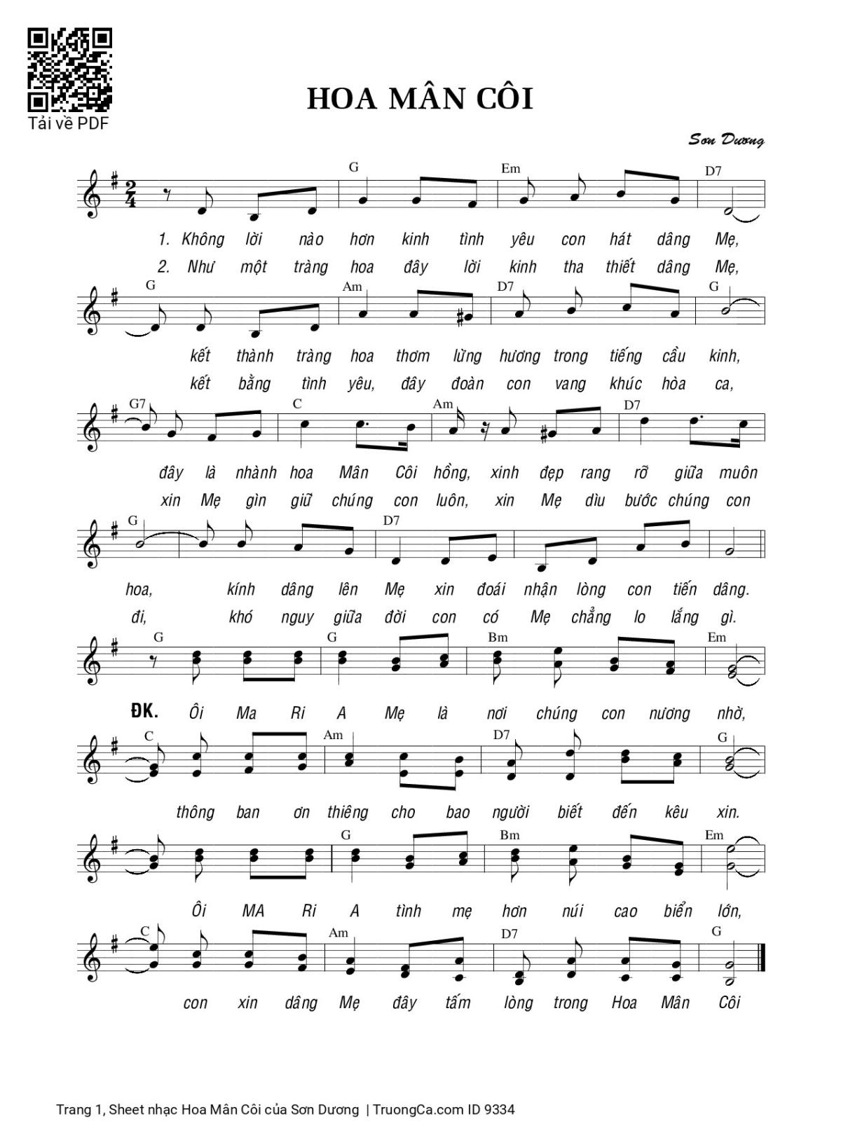 Điệp khúc. Ôi Maria Mẹ là nơi chúng con nương nhờ, thông ban ơn thiêng cho bao người biết đến kêu xin. Ôi Maria tình mẹ hơn núi cao biển lớn, con xin dâng Mẹ đây tấm lòng trong Hoa Mân Côi.