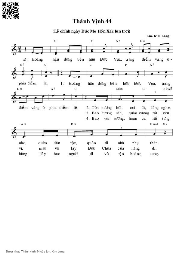 Lm. Kim Long Hoàng hậu đứng bên hữu Đức Vua trang điểm vàng ô phia diễm lệ [PDF] [Sheet] [Lời H.A] [Mp4/Midi]