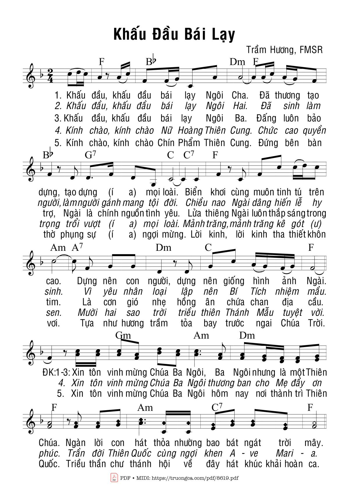 1. Khấu đầu, khấu đầu bái lạy Ngôi Cha. Đã thương tạo dựng, tạo dựng (í a) mọi loài. Biển khơi cùng muôn tinh tú trên cao. Dựng nên con người dựng nên giống hình ảnh Ngài. Xin tôn vinh mừng Chúa Ba Ngôi, Ba Ngôi nhưng là một Thiên Chúa. Ngàn lời con hát thỏa nhường bao bát ngát trời mây.