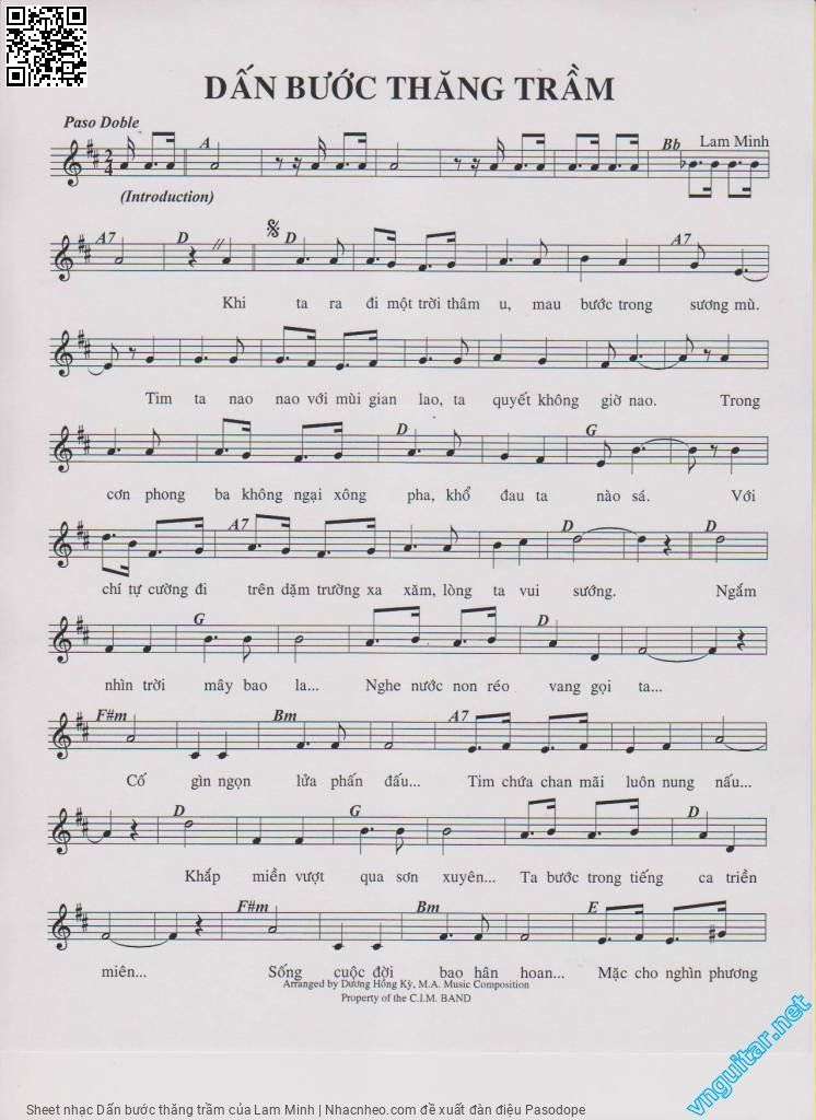 Chọn nút dấu + để tăng tông lên nửa cung, nút dấu - để giảm tông xuống nửa cung. Rê chuột vào hợp âm để xem các thế bấm hợp âm của bài hát Dấn bước thăng trầm.