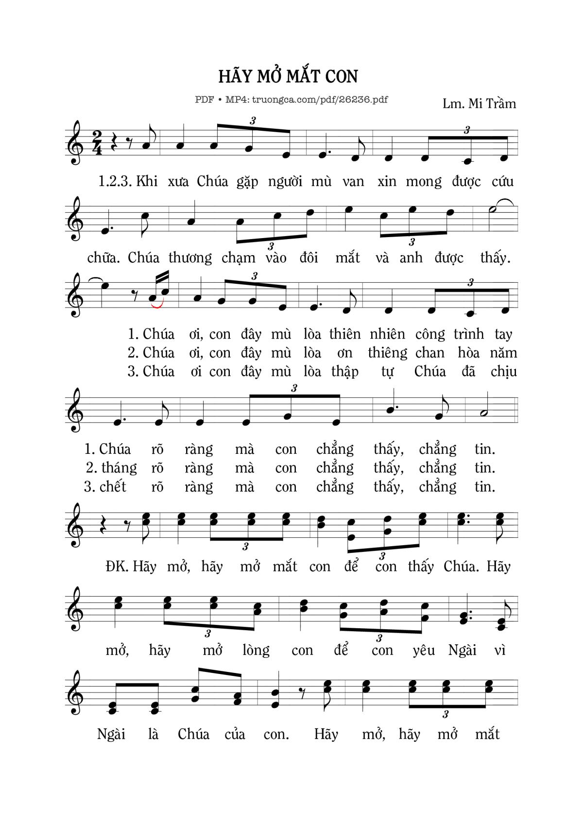Điệp khúc. Hãy mở, hãy mở mắt con để con thấy Chúa. Hãy mở, hãy mở lòng con để con yêu Ngài vì Ngài là Chúa của con. Hãy mở, hãy mở mắt con để con thấy Chúa. Hãy mở, hãy mở lòng con để con yêu Ngài vì Ngài là Chúa của con.