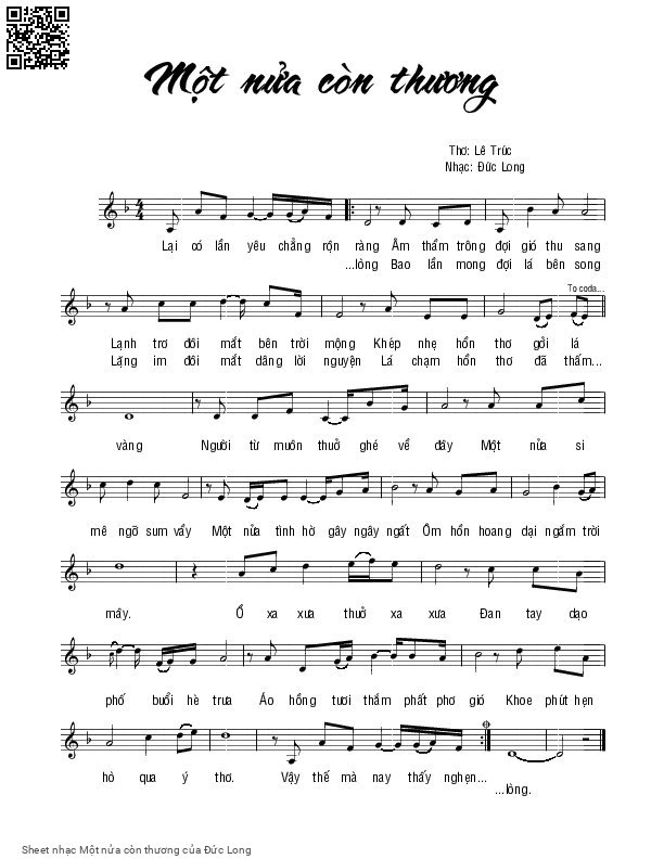 Phần nghe hát Một nửa còn thương (Đức Long) được nhúng từ Youtube, Musescore hoặc link ngoài và chịu sự kiểm soát bản quyền của bên thứ ba đó, vì vậy có thể bị xóa hoặc chèn quảng cáo bất kỳ lúc nào. Nếu bạn không nghe - xem được ca sĩ hát tức là đã bị Youtube hoặc Musescore kiểm soát.