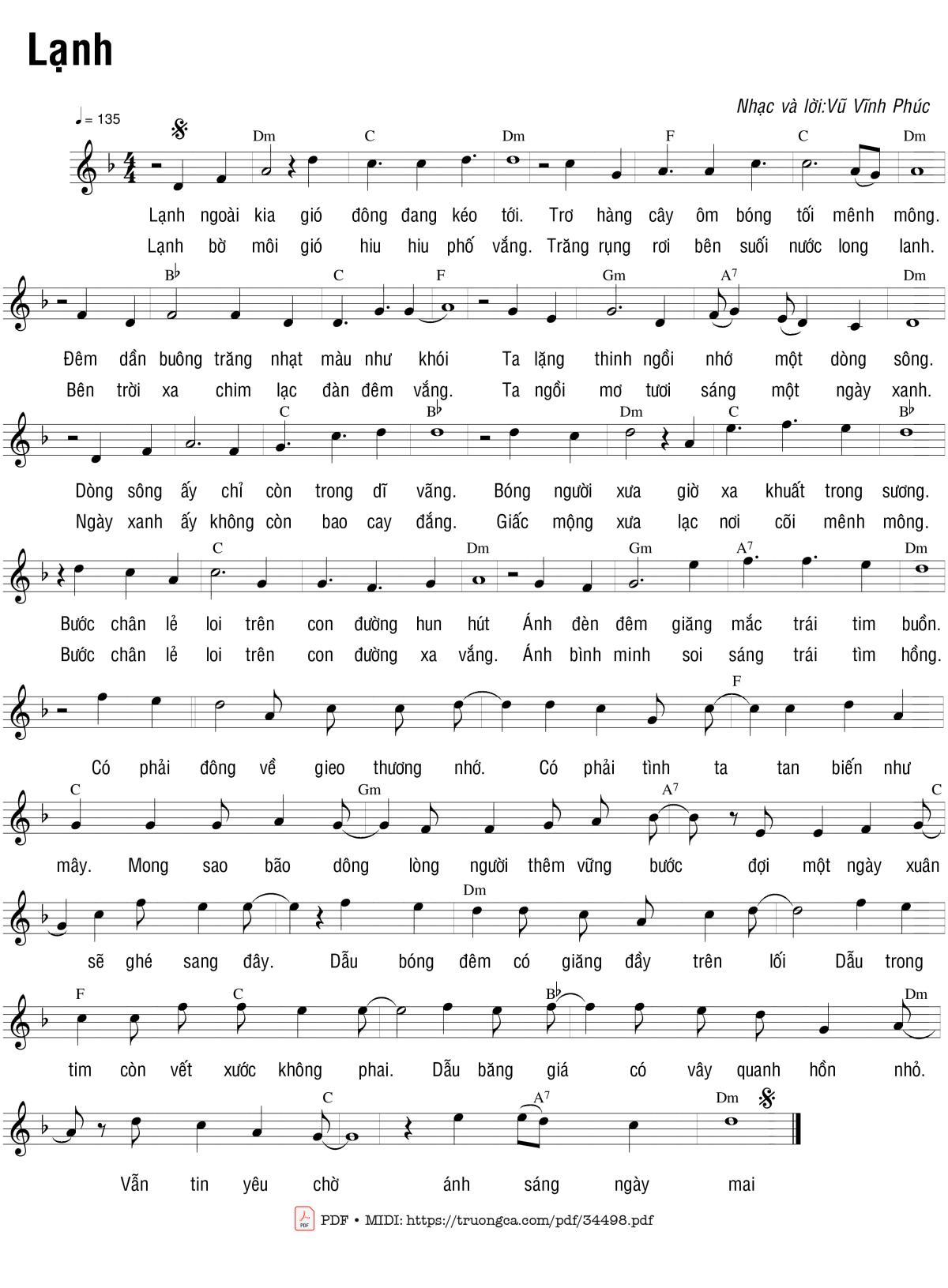 Phần nghe hát Lạnh (Vũ Vĩnh Phúc) được nhúng từ Youtube, Musescore hoặc link ngoài và chịu sự kiểm soát bản quyền của bên thứ ba đó, vì vậy có thể bị xóa hoặc chèn quảng cáo bất kỳ lúc nào. Nếu bạn không nghe - xem được ca sĩ hát tức là đã bị Youtube hoặc Musescore kiểm soát.