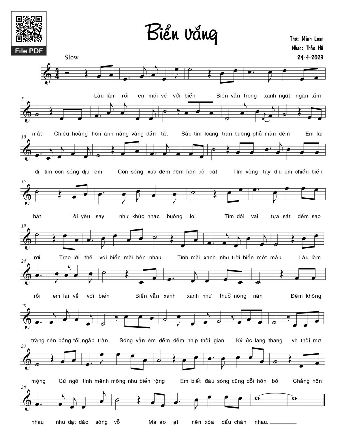 Thảo Hồ Lâu lắm rồi em mới về với biển Biển vẫn trong xanh ngút ngàn tầm mắt [PDF] [Sheet] [Lời H.A] [Mp4/Midi]