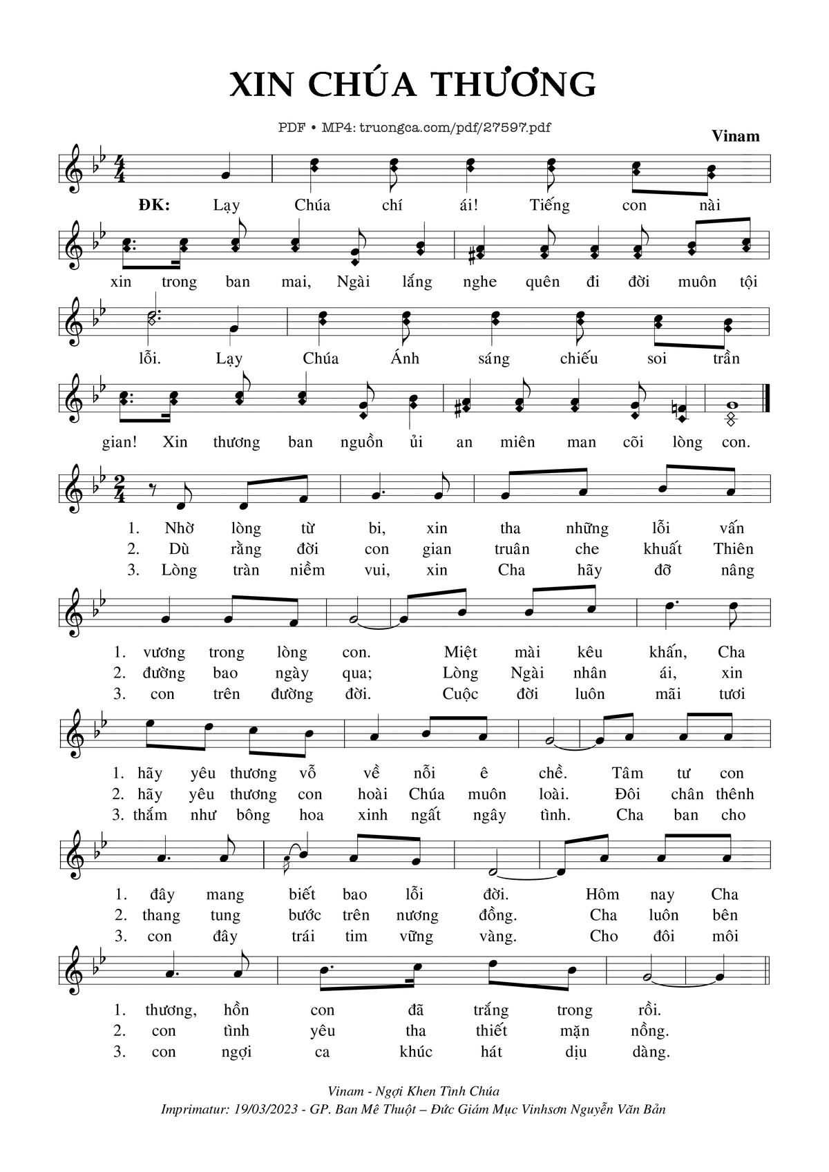 Phần nghe hát Xin Chúa Thương ( Vinam) được nhúng từ Youtube, Musescore hoặc link ngoài và chịu sự kiểm soát bản quyền của bên thứ ba đó, vì vậy có thể bị xóa hoặc chèn quảng cáo bất kỳ lúc nào. Nếu bạn không nghe - xem được ca sĩ hát tức là đã bị Youtube hoặc Musescore kiểm soát.